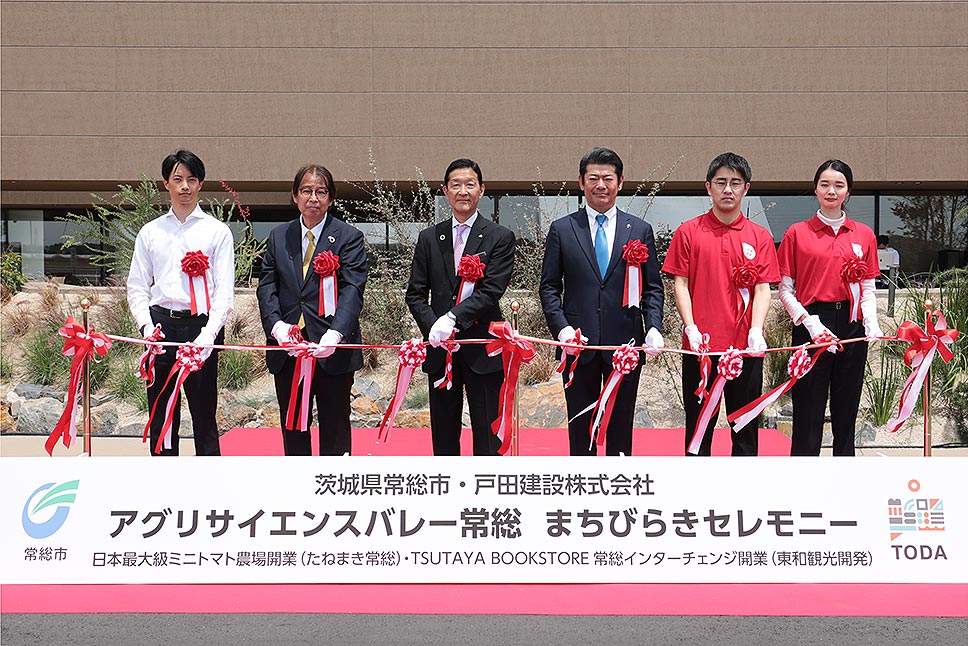 グランドオープンの前日、5月26日には、ここアグリサイエンスバレー常総まちびらきセレモニーが開かれ、常総市 神達たけし市長をはじめ、戸田建設 植草弘 執行役員副社長戦略事業本部長、SBプレイヤーズグループたねまき 藤井宏明 代表取締役社長、たねまき常総 前田亮斗 代表取締役社長、同 滝田美和PR担当、施設を運営する東和観光開発 小林岳志 代表取締役、今井剛志館長らが登壇。