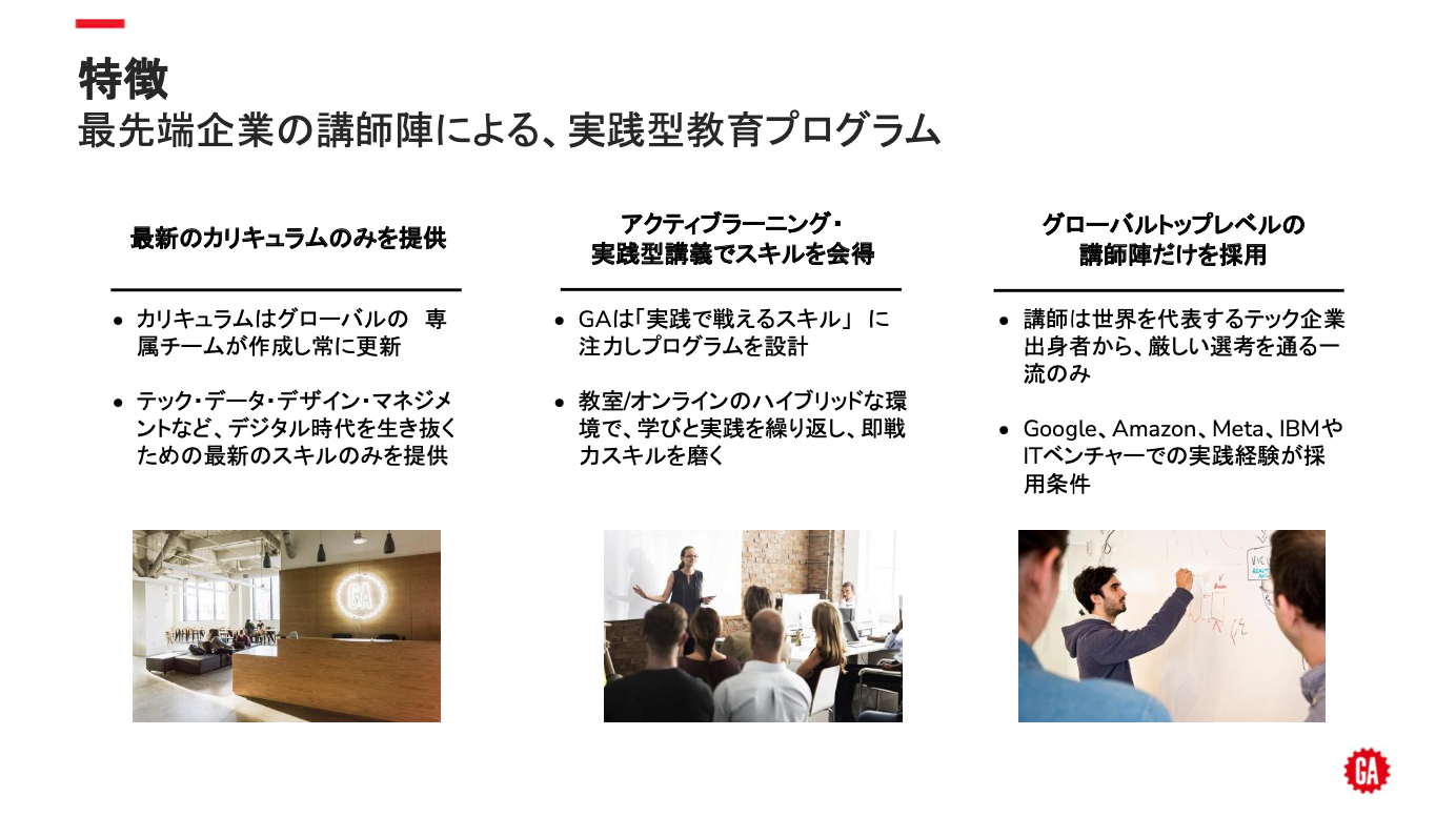 2011年にニューヨークに設立された「GA」は、これまで世界規模でデジタル教育に特化したプログラムを提供してきました。同社は日本におけるリスキリングの課題を解決する策として「企業トップ主導で推進し、経営戦略と結び付けて計画的に実施する」、「社員に対するインセンティブをきちんと設定する」、「業務時間内にリスキリングの時間を設定する」という3つのポイントを挙げています。