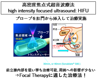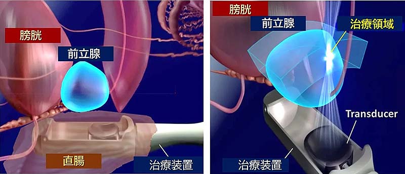 高密度焦点式超音波が出るスティック状の治療機器を、肛門に入れて、あらかじめ設定しておいた位置情報や各種データなどをもとに、前立腺がん部分だけをピンポイントに超音波でアタックし、細胞を破壊していく。