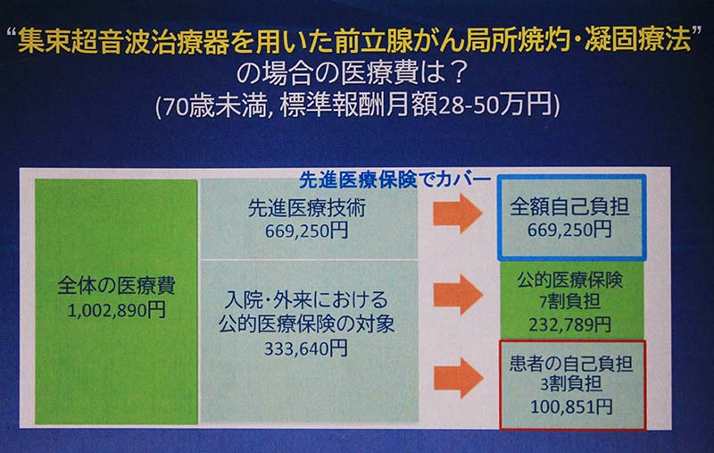 次に患者が支払う医療費。その1例は、先進医療技術 約67万円+入院・外来による公的医療保険対象 約33万円=合計約100万円。