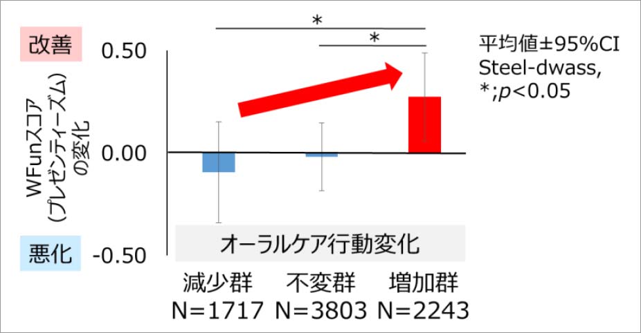 その結果、オーラルケア行動が増加した群では、そうでない群と比較して有意にプレゼンティーズムが改善していたことがわかった。