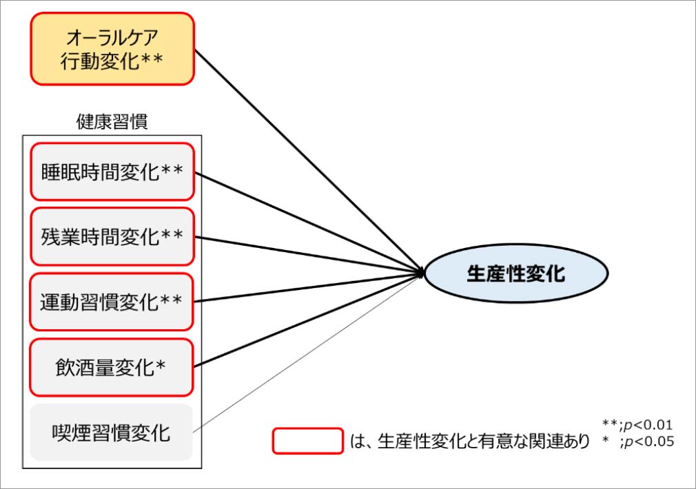 以上のことから、オーラルケア習慣の改善は、他の健康習慣の改善と同様に、生産性向上に寄与する可能性が示されたという。
