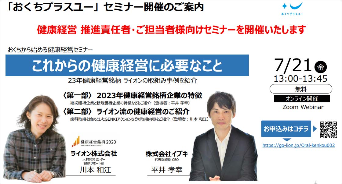 7月21日には、健康経営 推進責任者・担当者向け「おくちから始める健康経営セミナー『これからの健康経営に必要なこと』」も開催。詳細は、公式サイトをチェックしてみて↓↓↓