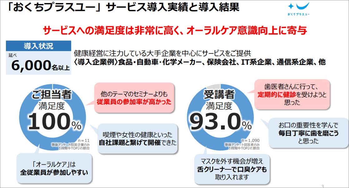 オーラルケアに関する情報を専門家がリアルタイムで講演するオーラルケアセミナー、唾液を検査機械で測定することでお口の健康状態を見える化し意識行動変容を促す唾液検査サービス、e-learning などのオーラルケア啓発WEBコンテンツとオーラルケアグッズ配付を組み合わせることで意識行動変容を促すオーラルケアサポートコンテンツサービスなどを展開している。