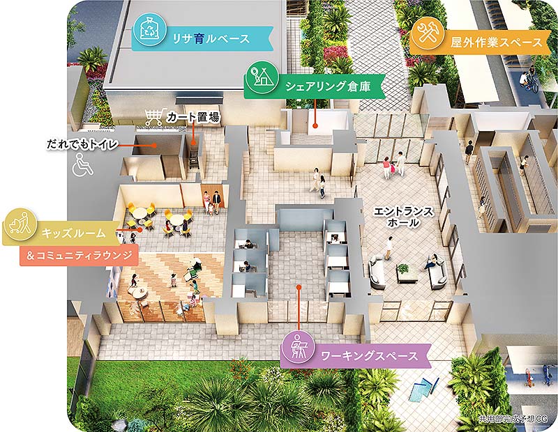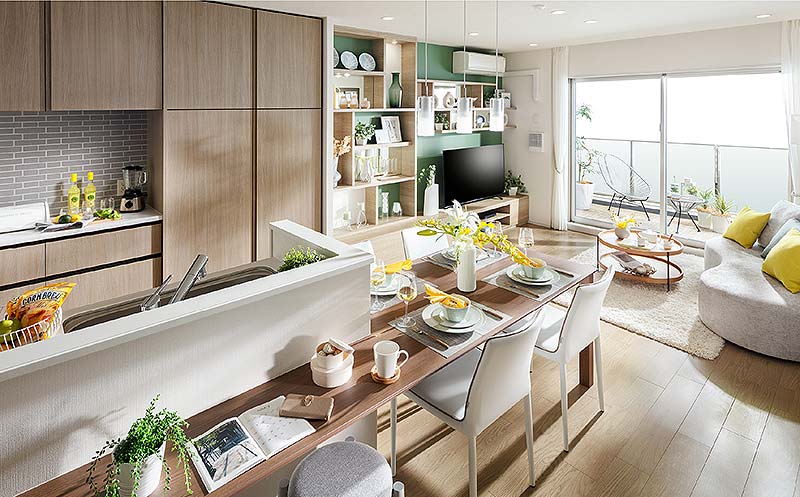 価格以上を実感できるディスポーザーや食洗機、食器棚、床暖房、平置き駐車場、シェアリング倉庫、コミュニティラウンジ、キッズルーム、屋外作業スペースなどが特長。