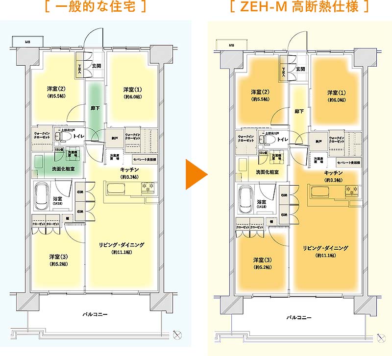 ZEH-M Oriented マンション「ルピアグランデみずほ台」は、ZEH-M 高断熱仕様で心地いい室温を家中でキープし、リビングと廊下など室内の温度差も少なく、気温の低い冬でも快適に過ごせる。