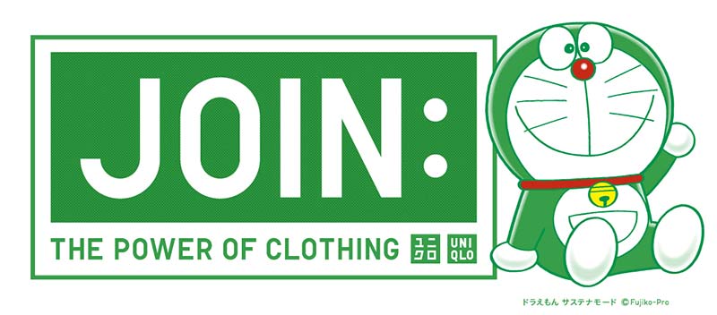 「JOIN:THE POWER OF CLOTHING」プロジェクト始動にあわせ、生地にリサイクルポリエステルを100%使用した、ユニクロのグローバルサステナビリティアンバサダー「ドラえもん サステナモード」の新デザイン商品(Tシャツ、ポケッタブルバッグ)を、6月5日から発売していく。