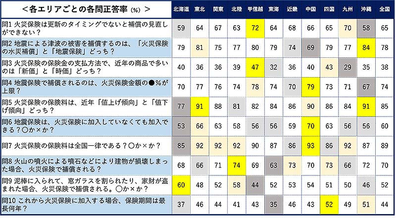 最も正答率が高かったのは「中国」エリア(93%)。2021年5月に全国的に火災保険料の参考純率料率の見直しが行われたが、山口県では築10年以上の木造家屋で、料率が引き下げとなった。