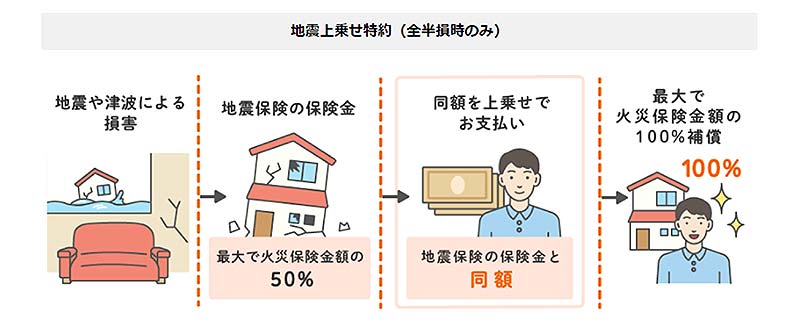 地震保険で補償される金額は、最大でも火災保険の保険金額の50%となっているなか、ソニー損保の新ネット火災保険では、「地震上乗せ特約(全半損時のみ)」をセットすることで最大100%(火災保険に対して)の補償にすることが可能。