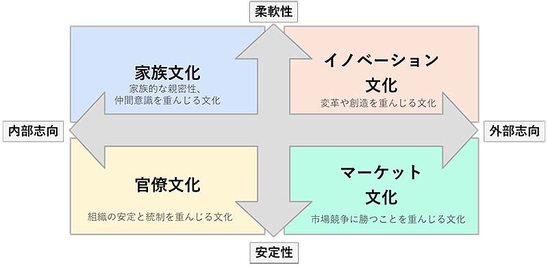 ミシガン大学のロバート・クイン、キム・キャメロンらにより開発された「競合価値観フレームワーク」では、横軸で組織が内部志向もしくは外部志向であるかを表し、縦軸で安定性を重視する文化なのか柔軟性のある文化なのかどうかを表している。