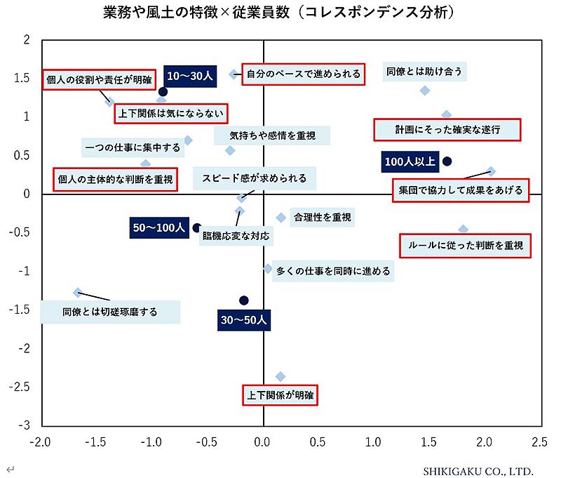 業務や風土の回答結果について従業員数別のコレスポンデンス分析を行ったところ、『10~30人』では自分のペースで、上下関係を気にせず、個人の役割が明確で個人の主体的な判断を重視するというスタイル。