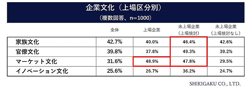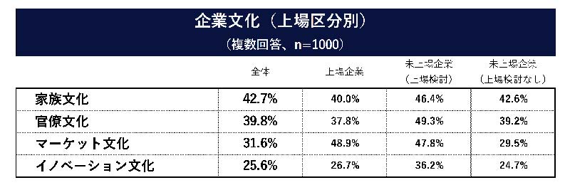 また上場を検討している企業は「官僚文化」「家族文化」「マーケット文化」がいずれも50%弱であることがわかった。