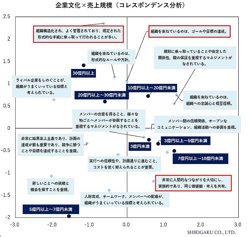 企業文化について売上規模別の特徴を把握するためにコレスポンデンス分析を行ったところ、売上規模10億円を境に上下方向に大きく分かれることに。