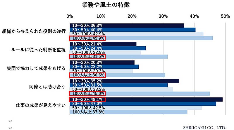 それに対して、『100人以上』では計画にそって、ルールに従った判断を重視して集団で協力して成果を上げるという大きな違いがみられた。