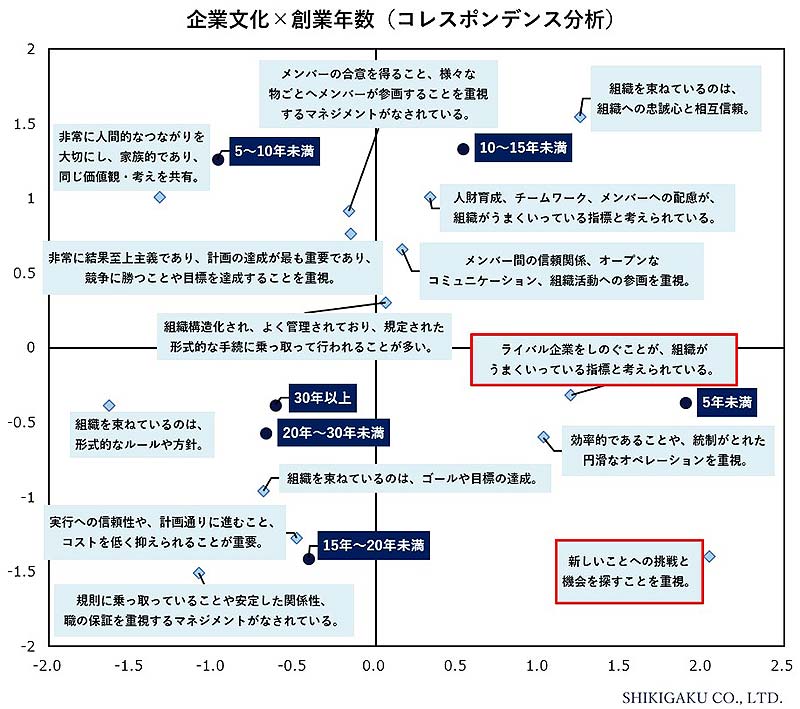 これは年数がたつにつれて、経営基盤が安定してくることによって、「家族文化」が醸成されてくるのではないかと考えられる。