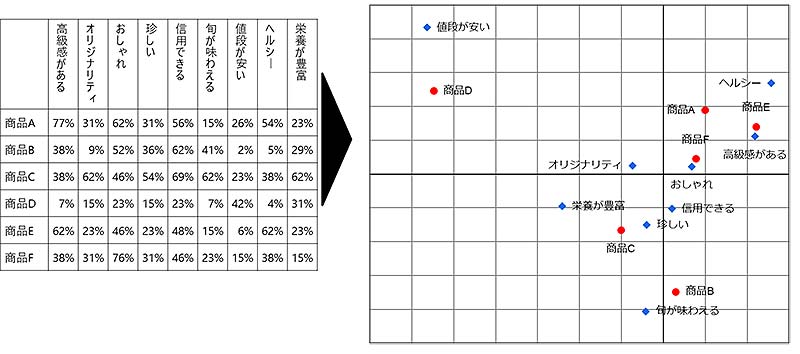 パリ第6大学のジャン=ポール・ベンゼクリによって開発されたコレスポンデンス分析は、統計学上のデータ解析手法のひとつで、集計表の形から複数の要素の類似度や関係の深さを調べることに長けた分析手法であり、近くにプロットされているマーカーほど類似性・関連性が高いことを示している。