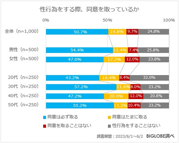 「性行為をする際、同意を取っているか」と質問したところ、「同意は必ず取る」と回答した人の割合はどの世代でも半数程度にとどまった。