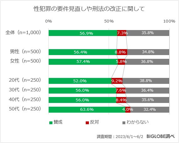 全国の20代から50代の男女1,000人に「性犯罪の要件見直しや刑法の改正に関して」という質問で賛成/反対を尋ねたところ、男女別では女性の方が「賛成」と回答した人の割合が高く57.4%、年代別では50歳が一番高く63.6%となった。
