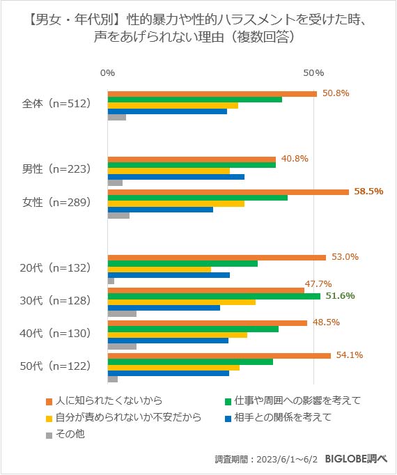 「性的暴力や性的ハラスメントを受けた時、声をあげられると思うか」の質問に「思わない」と回答した512人にその理由を複数回答で質問したところ、一番多かった回答は、「人に知られたくないから」で50.8%、次いで「仕事や周囲への影響を考えて」で42.4%と続いた。