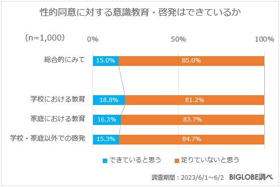 「性的同意に対する意識教育・啓発はできているか」を学校/家庭/学校・家庭以外でそれぞれ質問したところ、「できていると思う」と回答した人の割合が一番高かった学校でも18.8%しかなく、総合的にみても15.0%と低い割合となった。