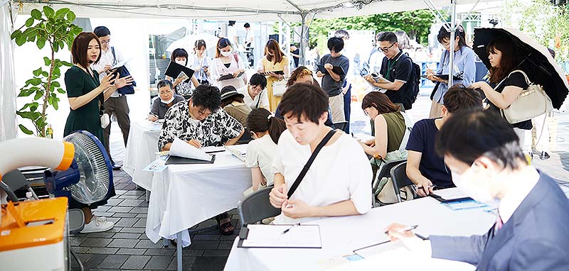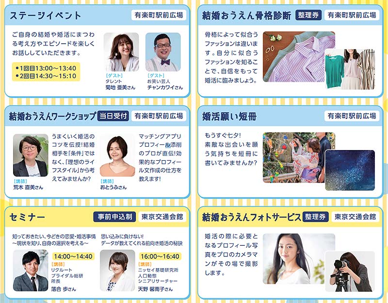 7月2日、有楽町駅前広場で開催された「TOKYO 結婚おうえんフェスタ」は、婚活コーディネーター荒木直美氏や マッチングアプリ 専門家 おとうふ氏 による結婚おうえんワークショップや、リクルートブライダル総研 落合歩 所長・ニッセイ基礎研究所 天野馨南子 シニアリサーチャーによるセミナー、結婚おうえんフォトサービス、結婚おうえん骨格診断、婚活願い短冊などが開催され、多くの来場者でにぎわった。