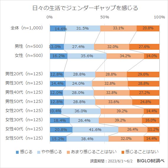 全国の20代から50代の男女1,000人に「日々の生活でジェンダーギャップを感じるか」を質問すると、「感じる」「やや感じる」をあわせ、男性の4割、女性の5割が日々の生活でジェンダーギャップを感じるという結果に。