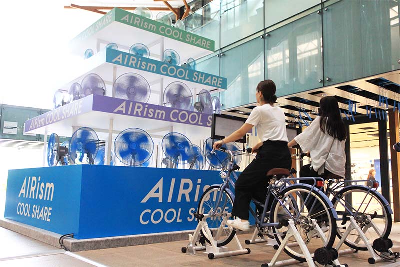 自分で涼しさを生み出す自涼自足な扇風機タワーは、自転車をこぐと全48台の扇風機が回りだし、こいでる人とまわりの人が、涼しさをシェアできるという仕組み。