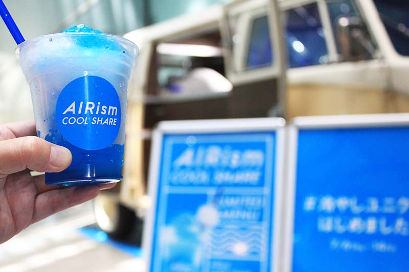エアリズムブルーになった店頭のユニクロロゴをはじめ「扇風機タワー」や「冷やしサウナ」など、みんなで涼しさをシェアしながらエアリズムの特性を体感できるアクティビティの展開や、オリジナルかき氷を販売!