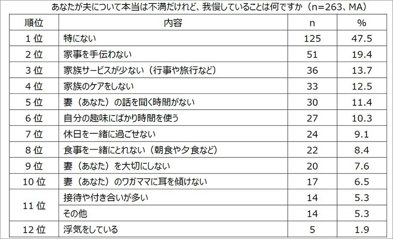 ◆夫について本当は不満だけれど、我慢していることが「特にない」約5割(47.5%)、次いで「家事を手伝わない」約2割(19.4%)