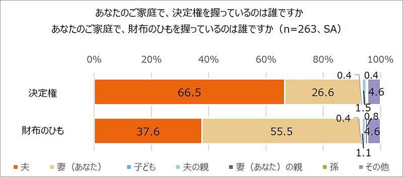中小企業経営者の妻263名に、家庭での権限について聞いたところ、家庭で決定権を握っているのは「夫」が最多で66.5%、一方、家庭で財布のひもを握っているのは「妻」が最多で55.5%という結果となった。