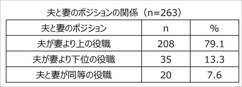 さらに、中小企業経営者の妻263名に、家庭内においてのそれぞれのポジションを会社の役職に例えて聞いたところ、夫の役職は「社長」が最も多く61.6%、妻(自分)は「部長」が最も多く26.2%だった。