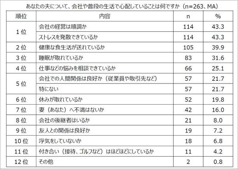 中小企業経営者の妻263名に、夫について心配していることは何か聞いたところ、全体では「会社の経営は順調か」、「ストレスを発散できているか」(各43.3%)が最も多く、次いで「健康な食生活が送れているか」(39.9%)、「睡眠が取れているか」(31.6%)と、会社の経営状態と夫の健康状態に関しての心配事が多いことがわかった。