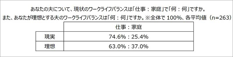 また、夫について、現実と理想のワークライフバランスについて聞いたところ、現実の「仕事:家庭」のバランスの平均は「7:3(74.6%:25.4%)」、理想の「仕事:家庭」のバランスの平均は「6:4(63.0%:37.0%)」と、そこまで現実と理想がかけ離れてはいないことがわかった。