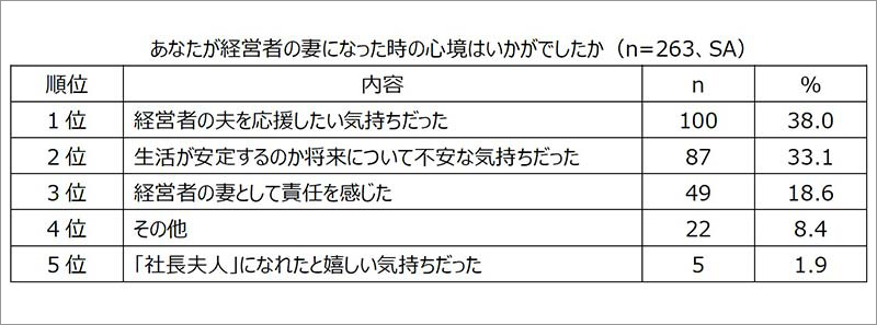中小企業経営者の妻263名に、経営者の妻になった時の心境を聞いたところ、1位「経営者の夫を応援したい気持ちだった」(38.0%)、2位「生活が安定するのか将来について不安な気持ちだった」(33.1%)、3位「経営者の妻として責任を感じた」(18.6%)となり、「『社長夫人』になれたと嬉しい気持ちだった」はわずか1.9%と、経営者の妻としての喜びよりも、自分たちの生活や社会的責任の重さを感じた妻が多かった。