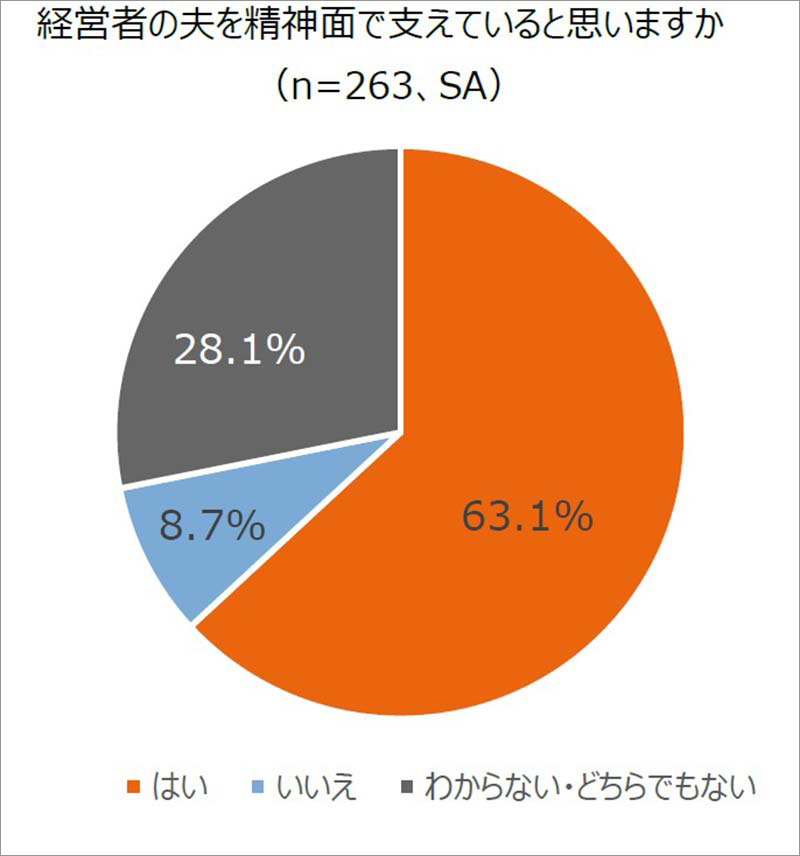 また、夫が経営者としてやっていけるのは妻(あなた)のおかげだと思うか聞いたところ、「はい」と回答したのは約3割(34.2%)で、「どちらでもない・わからない」が40.3%と最も高い結果とった。