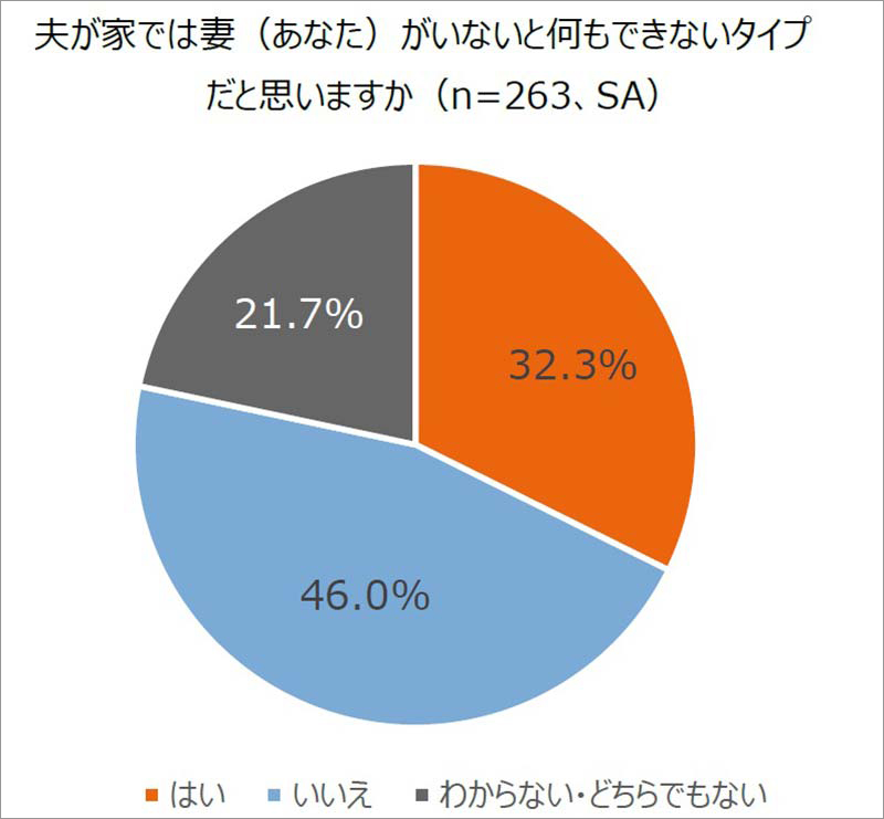 さらに、中小企業経営者の妻263名に、夫が経営する会社でワンマンだと思うか聞いたところ、「いいえ」という回答が約5割(52.9%)と最も多い結果だった。同様に、夫は家では妻(あなた)がいないと何もできないタイプだと思うか聞いたところ、「いいえ」という回答が最も多く約5割(46.0%)だった。