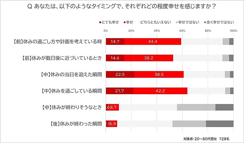 「Q1. あなたは以下のタイミングで、それぞれどの程度幸せを感じますか?」(n=728)と質問したところ、「とても幸せ」もしくは「幸せ」と回答したのは、「休みの過ごし方や計画を考えているとき」が59.1%、「休みが数日後に近づいているとき」が52.8%となり、半数以上が「休み前が幸せ」と回答した。