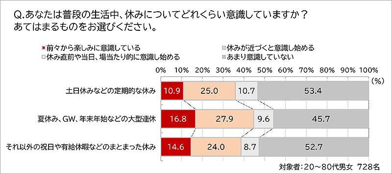 「Q2. あなたは普段の生活中、休みについてどれくらい意識していますか?」(n=728)と質問したところ、「前々から楽しみに意識している」と回答した割合は、「夏休み、GW、年末年始などの大型連休」が16.8%と最も高く、「それ以外の祝日や有休休暇などのまとまった休み」が14.6%、「土日休みなどの定期的な休み」が10.9%と続いたた。