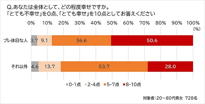 その結果、幸福度が8~10点と高点数を選択した人の割合は、「プレ休日」な人が50.6%と半数を超えた。