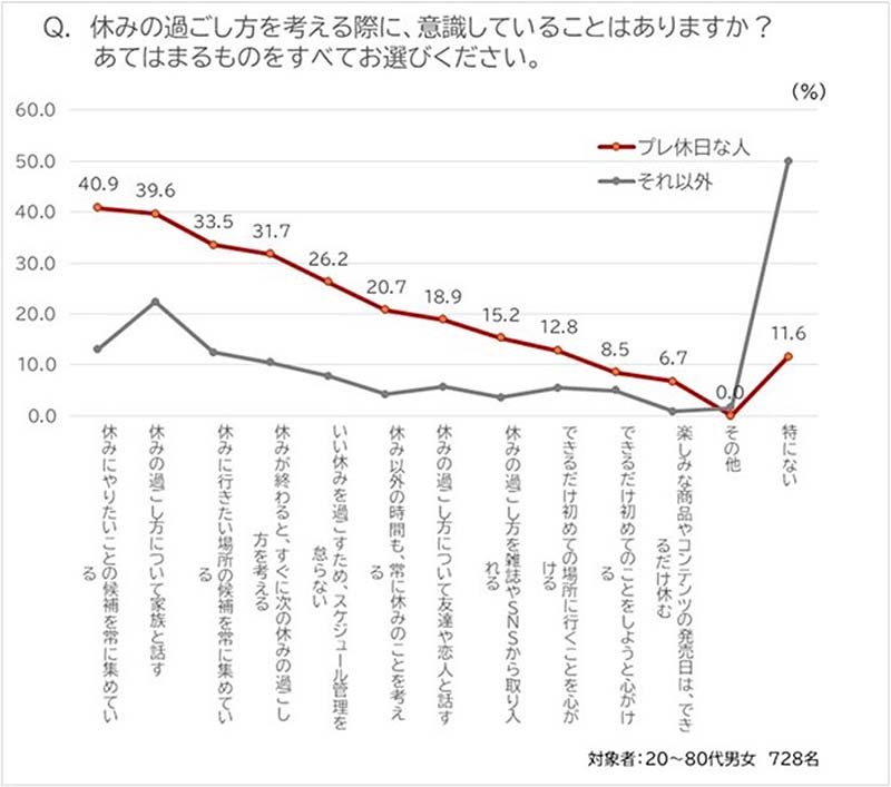「Q4. 休みの過ごし方を考える際に、意識していることはありますか?」(n=728)と質問したところ、「プレ休日」な人は「休みにやりたいことの候補を常に集めている」が40.9%と最も多い結果に。