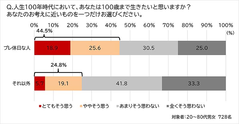 「Q5. 人生100年時代において、あなたは100歳まで生きたいと思いますか?」(n=728)と質問したところ、「プレ休日」な人は44.5%が「とてもそう思う」もしくは「ややそう思う」と回答。
