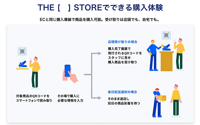 THE [ ] STORE での買い物は、ユーザーがいつものECサイトで購入するのと同じスタイルで決済・入手できる。
