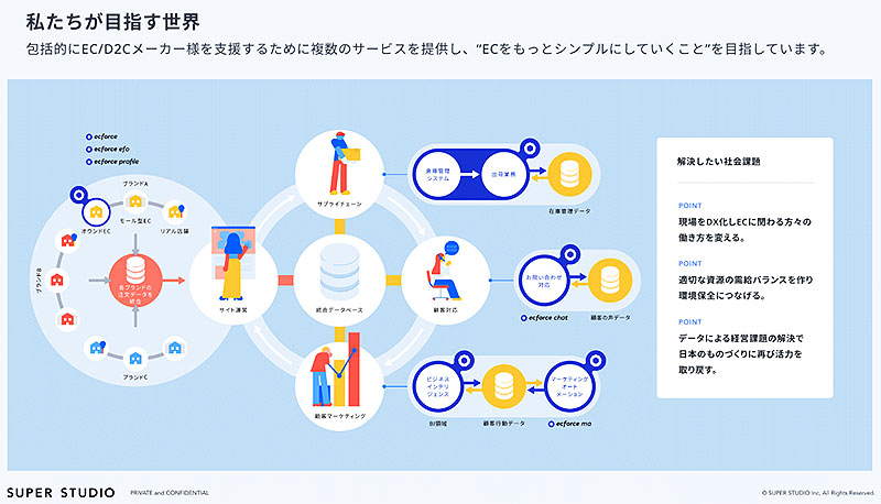 SUPER STUDIO は、自社EC事業運営や「ecforce」開発を続けてきた知見を活かし、システムやデータを統合管理することで、マーケティングからサプライチェーンまでEC事業運営における全工程にデータを活用した最適なPDCA運用を可能とする「次世代EC構想」の実現に向けた ecforce を中心とするさまざまなプロダクト開発・提供をしています。