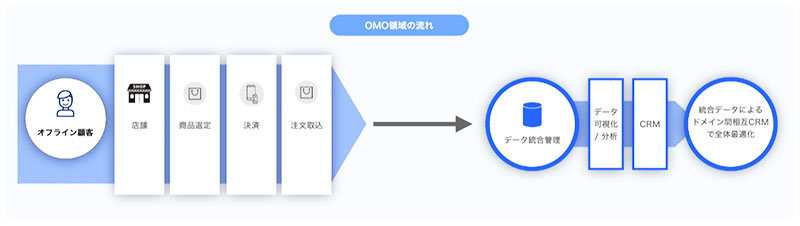 この THE [ ] STORE は、顧客にオンラインとオフラインの垣根を意識させず、モノやサービスの購入・体験を提供する Online Merges with Offline(OMO:オンラインとオフラインの融合)にむけたソリューションで、オンラインとオフラインそれぞれのデータを統合し、情報を一元管理することで顧客体験の向上を実現させる。