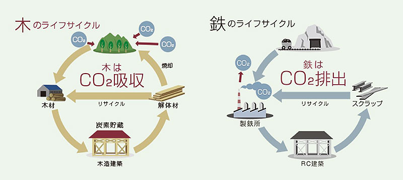 「木」は生長過程で CO2 を吸収し、伐採後も炭素を固定化し続けるため、木造建築は長期間炭素を大気に戻さないことに加え、伐採地に植林されることで CO2 吸収力は回復され、地球温暖化防止に貢献する。