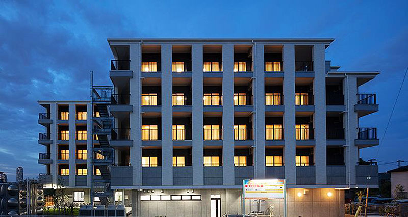 ツーバイフォー工法(枠組壁工法)では延床面積で国内最大となる 5階建て(1階 RC造)特別養護老人ホーム。