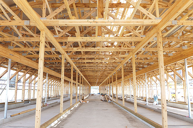 また、大断面材を使わず細い材で大スパンを実現させている点もポイント。