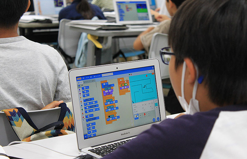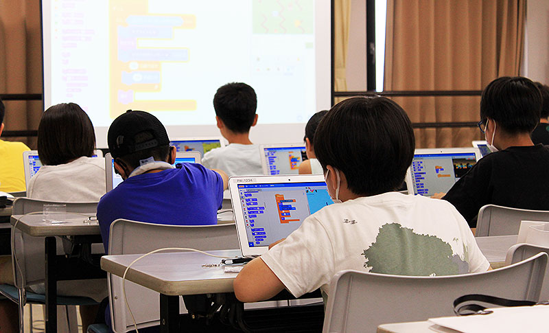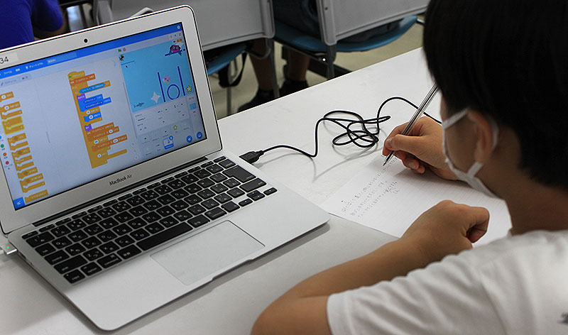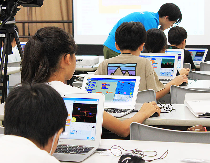 7月28日 新松戸市民センターで開催された回も、子どもたちは Cygames 講師に教わりながら、ノートPCで迷路プログラムを自分の手で組んでいった。