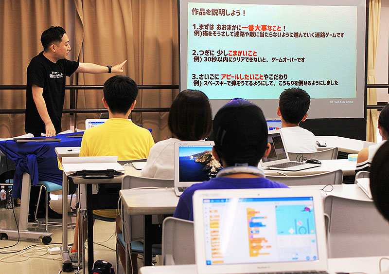 「じゃあ自分がつくったゲームを実際にやって見せて、みんなにプレゼンしよう。プレゼンは1分ぐらいで話せるようにしよう。文章は3つぐらい。大事なことは、結論・作品内容をいちばん最初にいう。そこから細かく説明していこう」
