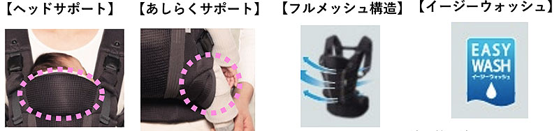 「首マモール」「ハイポジションシート」で、赤ちゃんの姿勢を支え呼吸をサポート。やわらかい頭と首がグラグラな新生児期のタテ抱きも安心。
